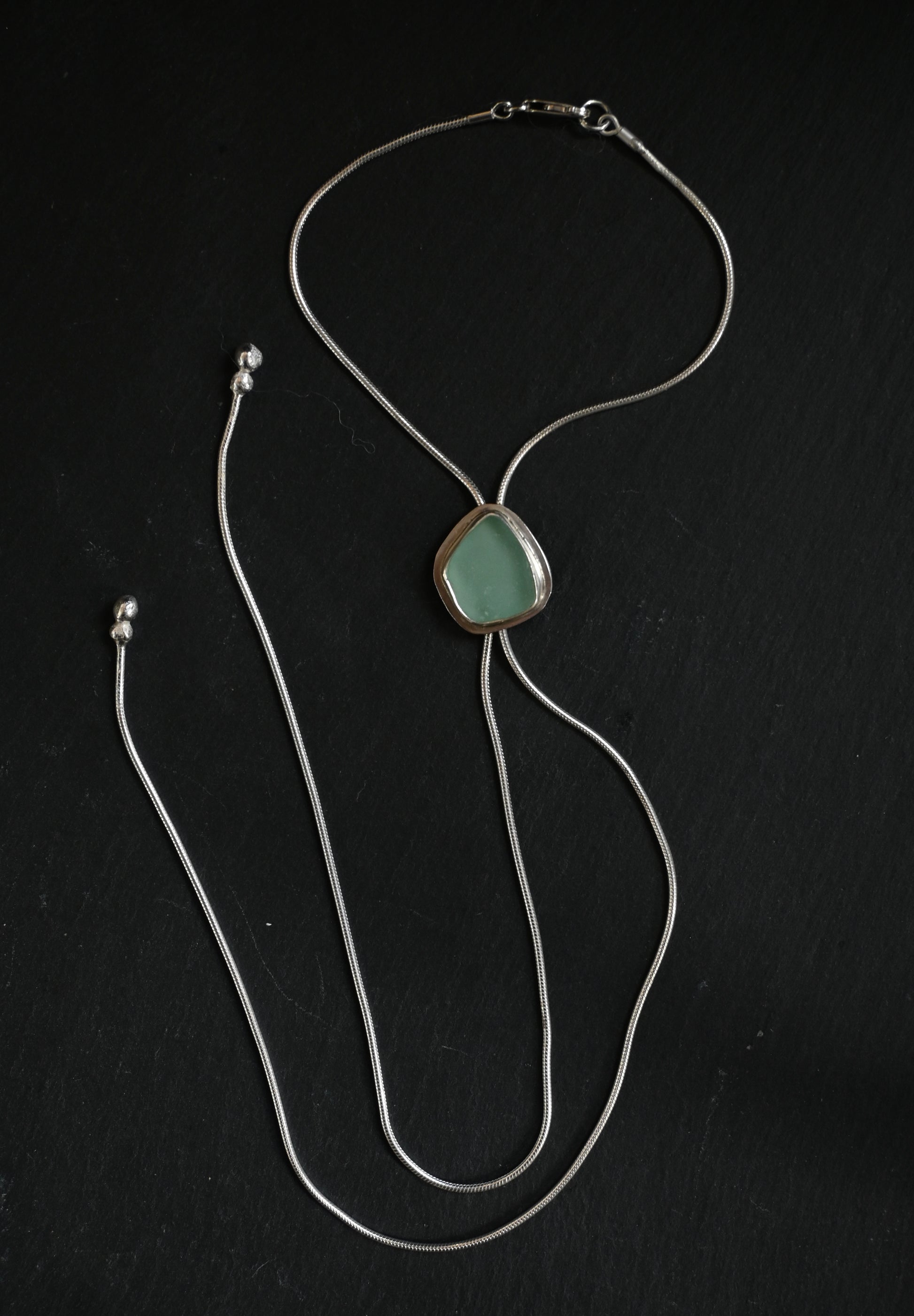Handmade .925 sterling silver bolo tie. Handpicked, one-of-a-kind sea glass found along the Northern California coast. Please keep in mind that this piece is not made by a machine, therefore it will look handmade. Each bolo is one-of-a-kind and unique in its own way.