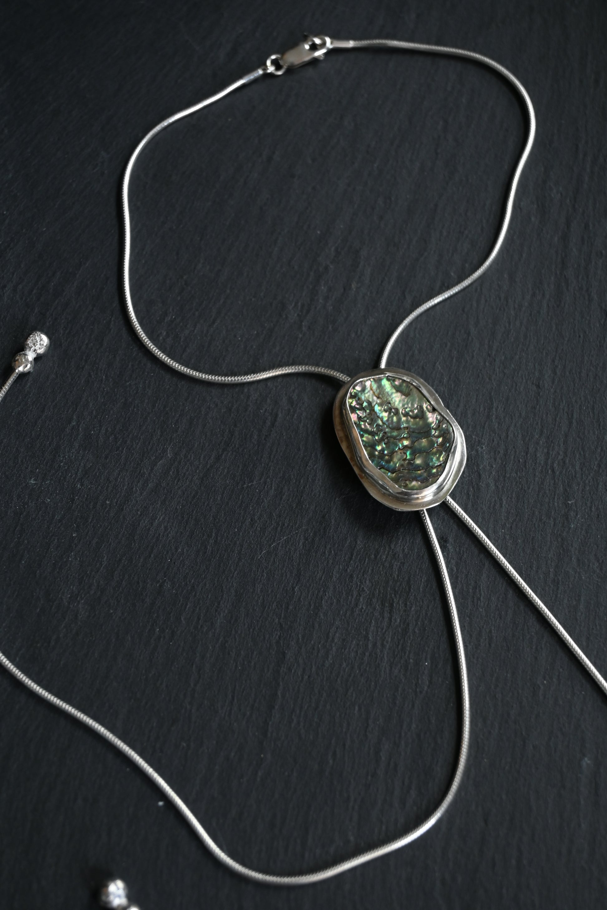 Handmade .925 sterling silver bolo tie. Handpicked, one-of-a-kind abalone shell found along the Northern California coast. Please keep in mind that this piece is not made by a machine, therefore it will look handmade. Each bolo is one-of-a-kind and unique in its own way.