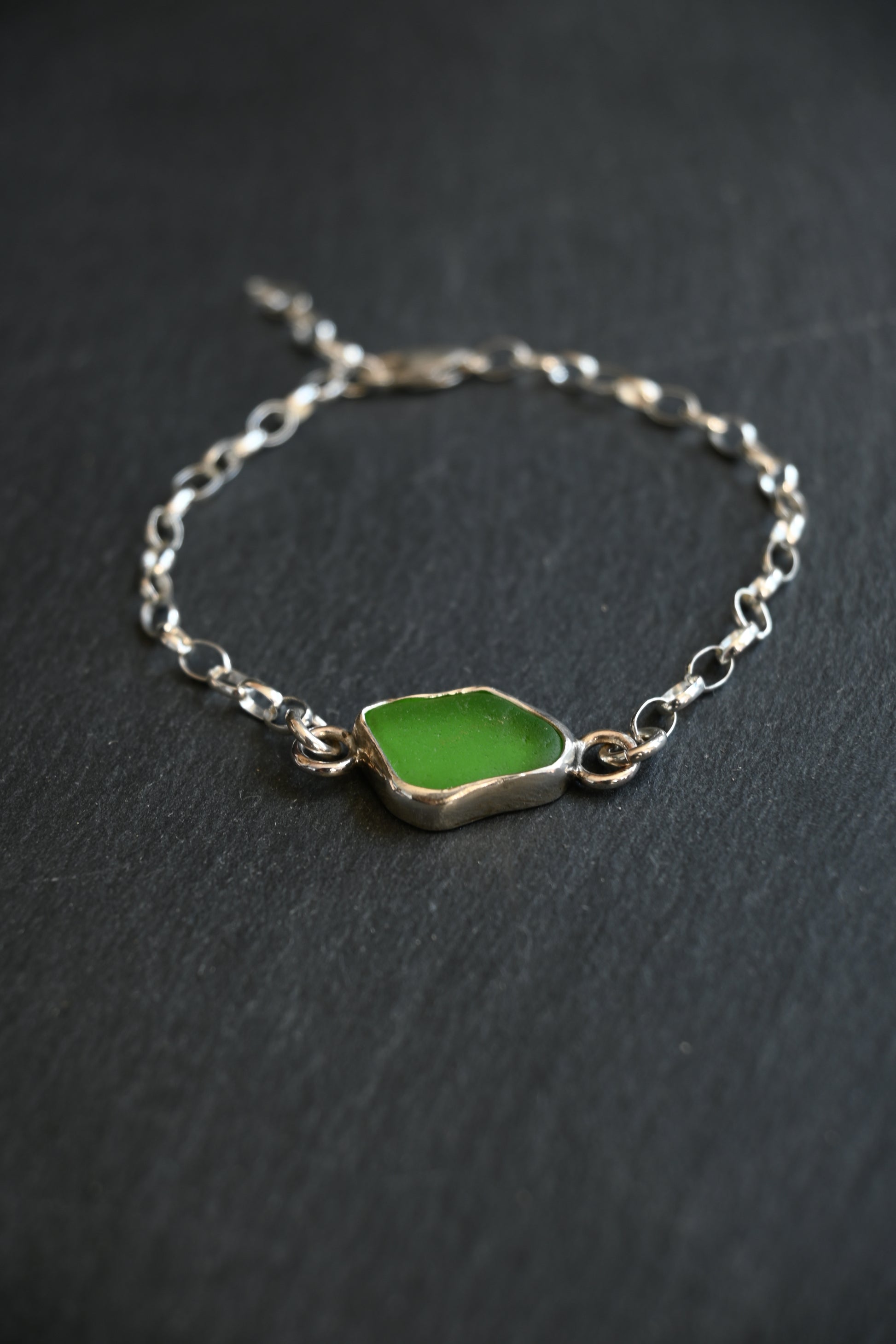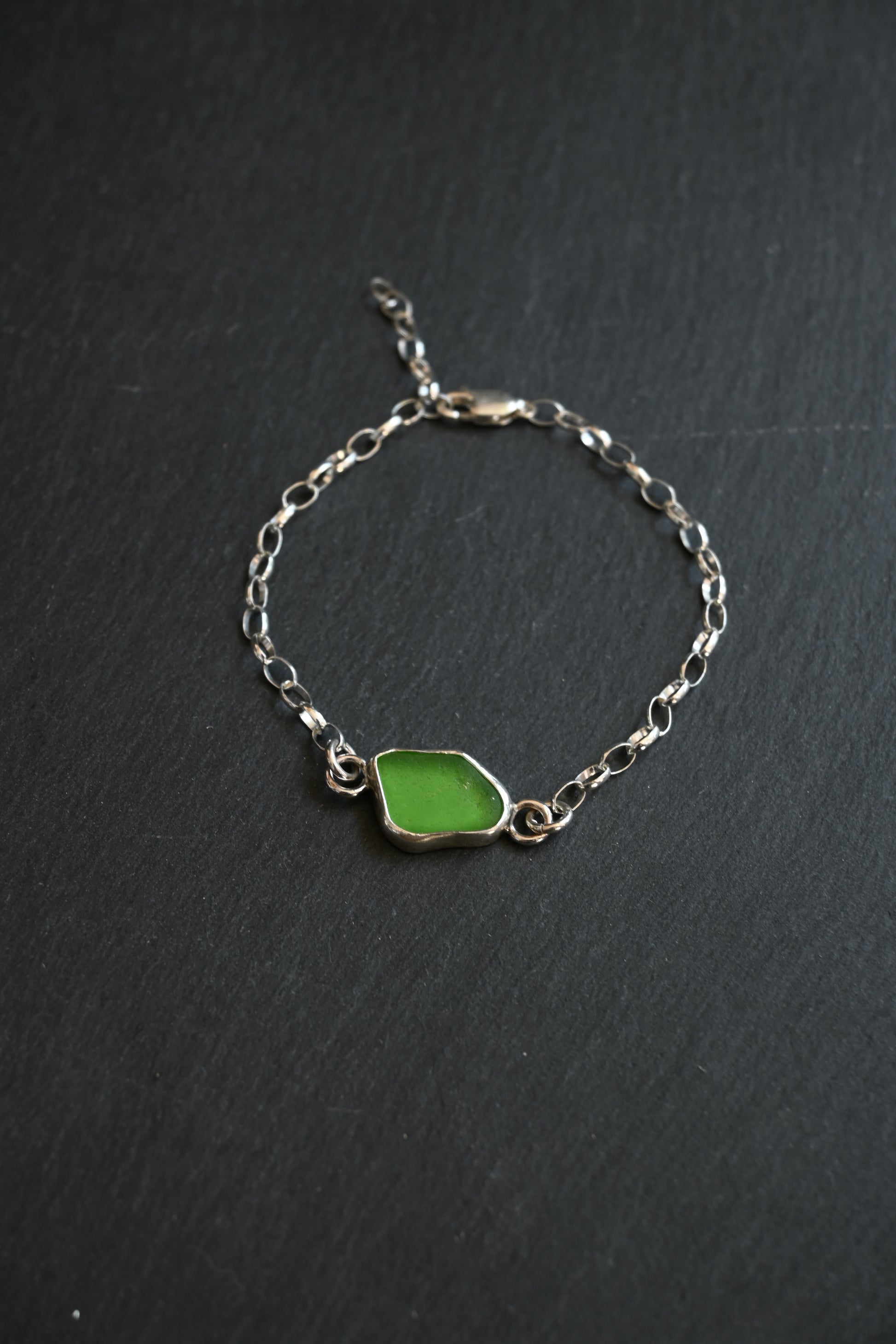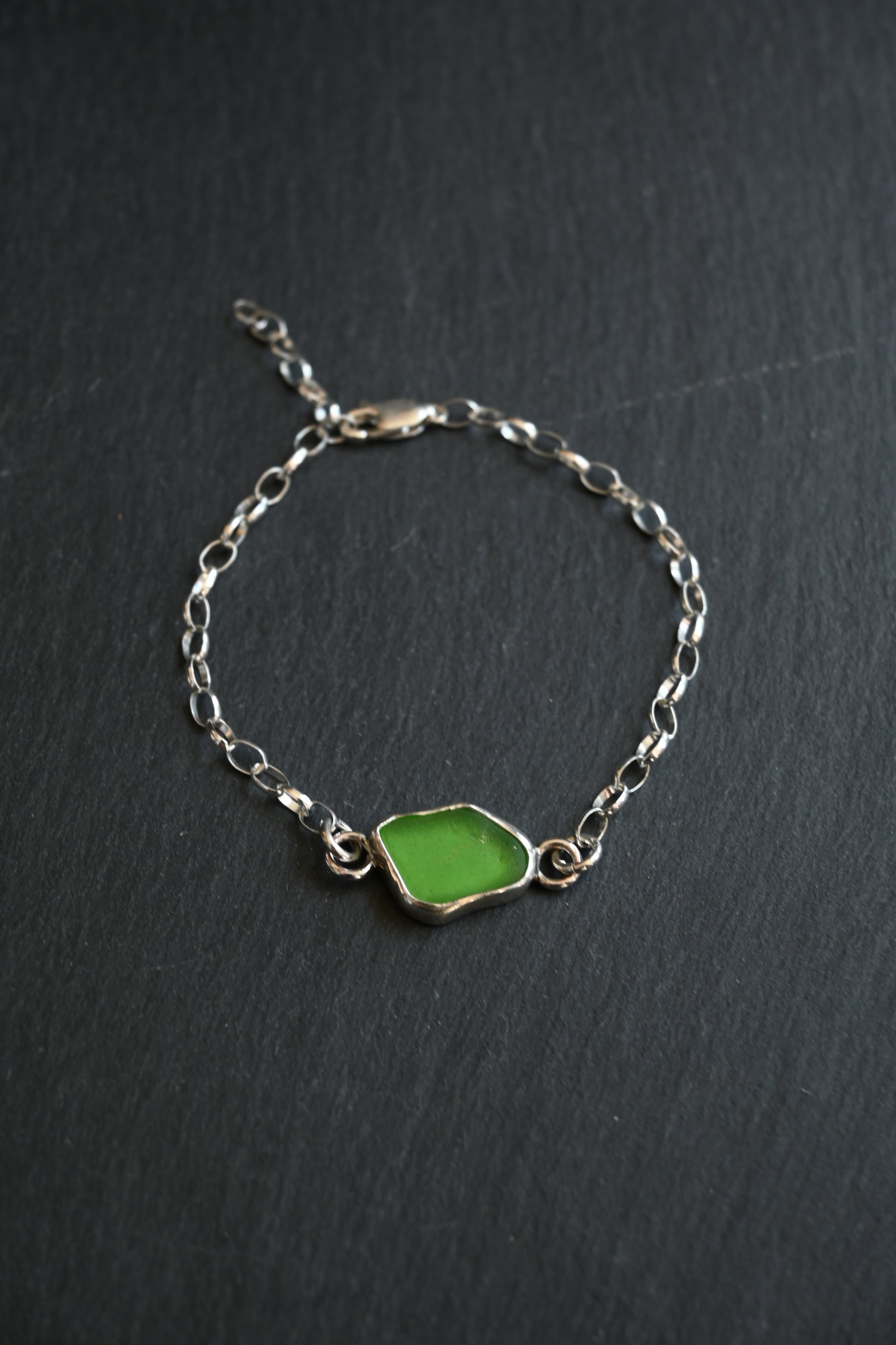 Handmade .925 sterling silver bracelet. Handpicked, one-of-a-kind sea glass found in Northern California. Please keep in mind that this bracelet is not made by a machine, therefore it will look handmade. Each piece is truly one-of-a-kind and unique in its own way.