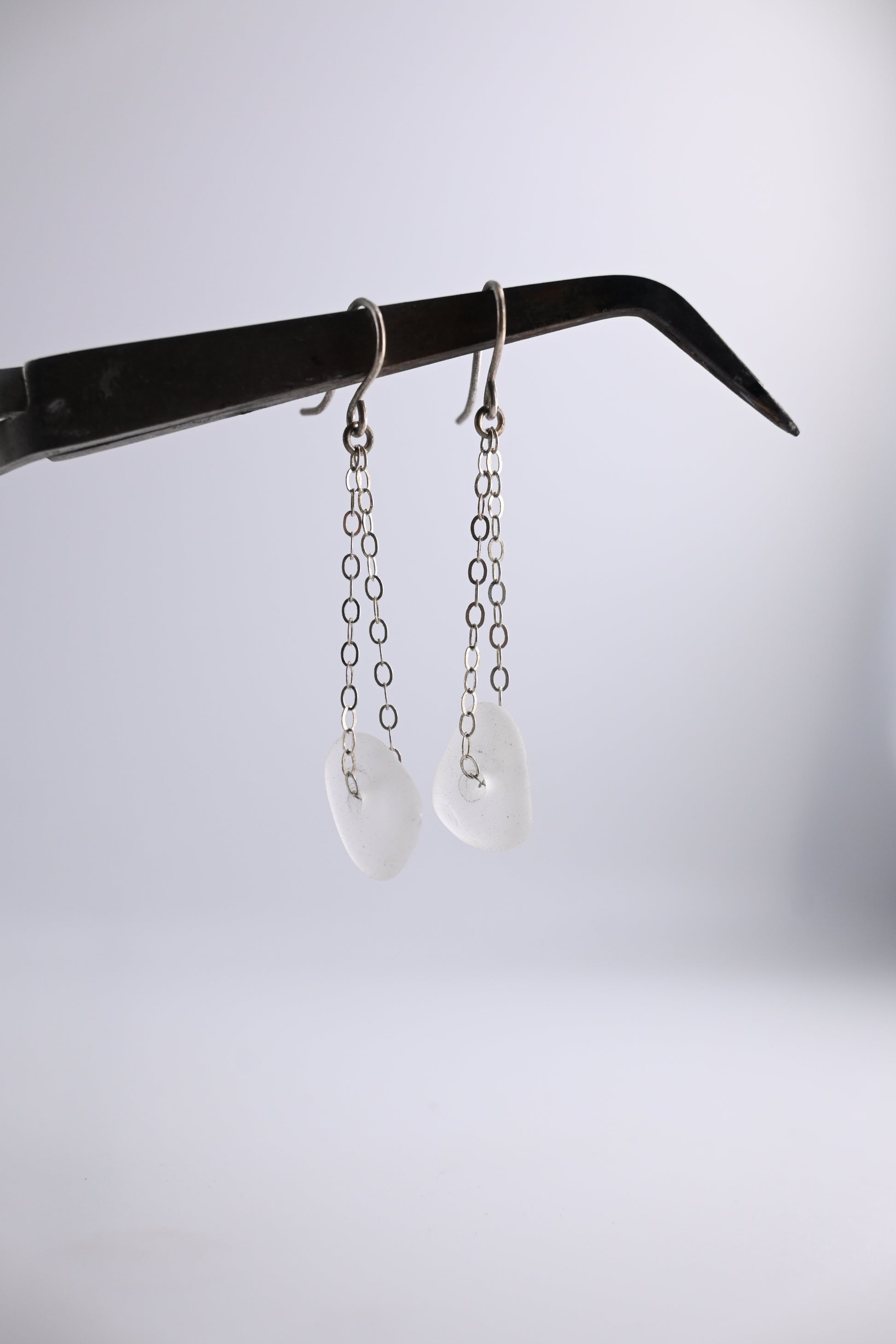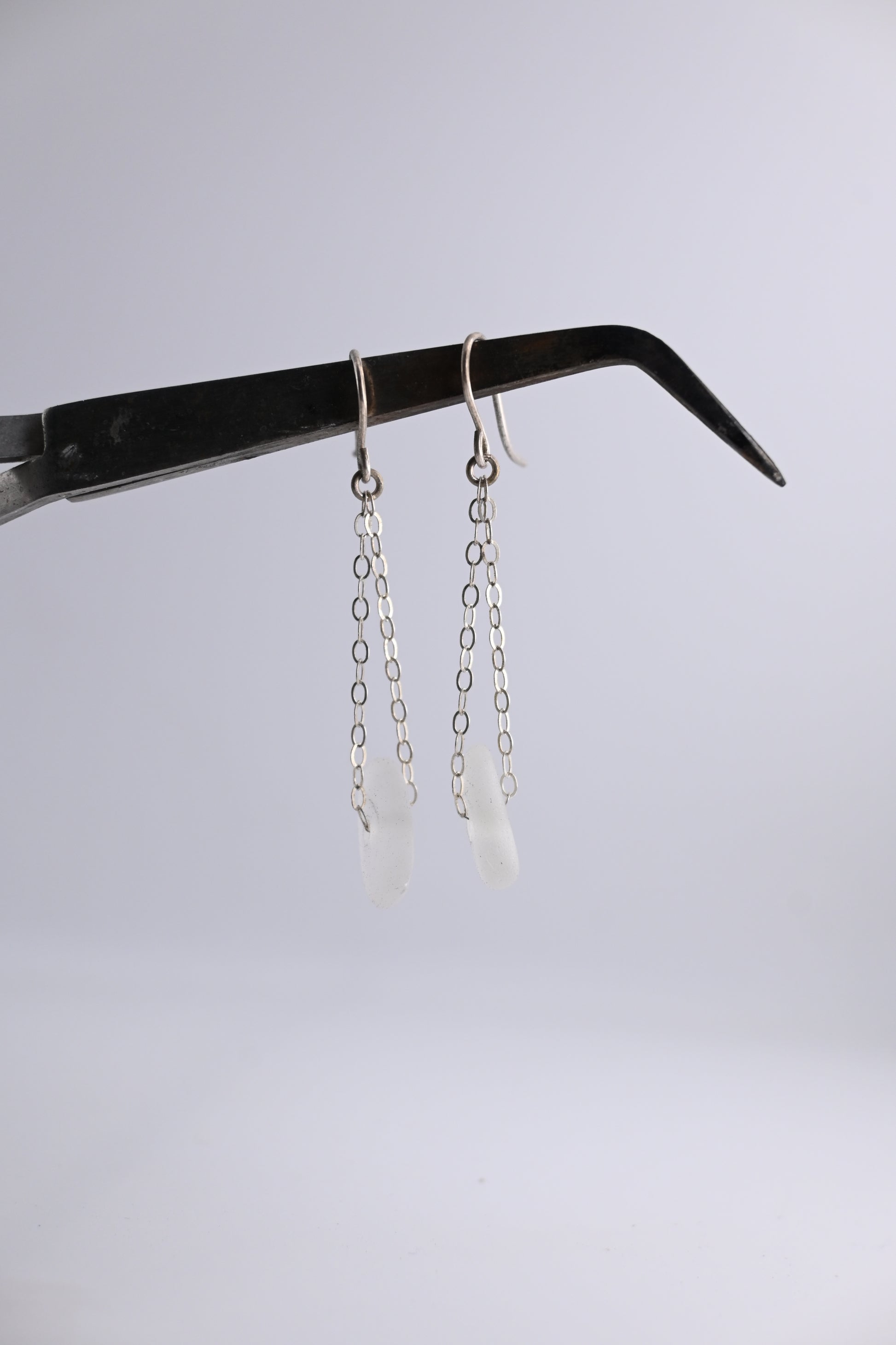 Handmade .925 sterling silver chained earrings. Featuring handpicked, one-of-a-kind sea glass found somewhere along the Pacific Coast. Please note that each piece is crafted by hand, not by a machine, so it will carry the subtle character and individuality that come with handmade work. Every pair is truly unique in its own way.